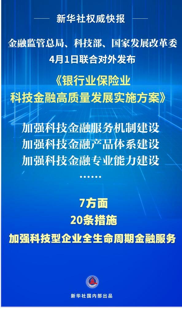 新华社北京4月1日电(记者李延霞、张千千)金融监管总局、科技部、国家发展改革委1日联合对外发布《银行业保险业科技金融高质量发展实施方案》,从加强科技金融服务机制、产品体系、专业能力和风控能力建设等方面提出具体举措,引导金融机构进一步加强科技型企业全生命周期金融服务。